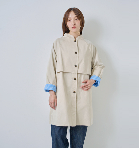 kelen(ケレン)より、フラップデザイン マオカラー ミドルジャケット “KILO”のご紹介です。スッキリと立ち衿が特徴のオーバーサイズコート。ラグランスリーブでゆったりと楽に着用頂けるシルエットです。袖は2枚仕立てで、袖口をロールアップすると裏地のストライプが見え、抜け感のあるスタイリングが完成します。