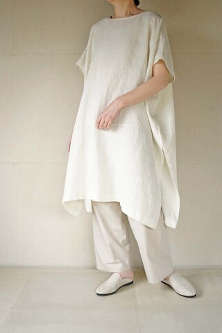 裾ゴムのパンツに目が留まり ついついオーダーしてしまうのですが このパンツもそのうちのひとつ テーパードしたシルエットや ウエストから入れたタックもアクセントになっています