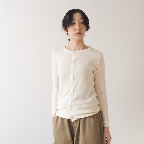 小さなボタンが並ぶ華奢な前立てと、首元にやさしく沿うクルーネックが、軽やかで上品な印象をつくります。