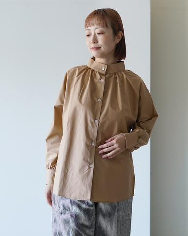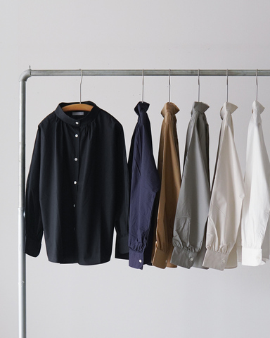シンプルなのに目を惹く、知性と品を感じさせるスタンドカラーシャツ。首元のギャザーがほどよい立体感を演出し、顔まわりをすっきりと見せてくれます。