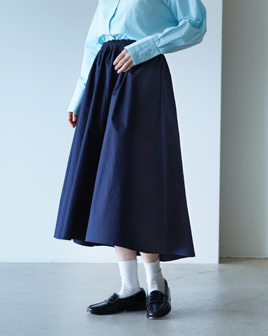 ギャザーが入ったシンプルなロングスカートです。前後差のあるデザインで、横から見てもふんわりと美しいシルエットを描きます。