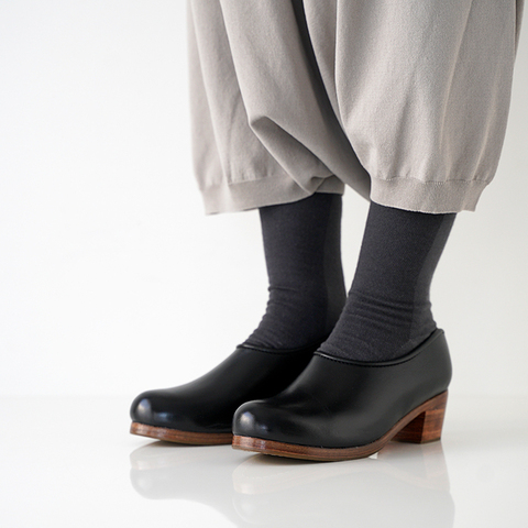 コロンとした愛らしいフォルムが印象的なヒールアップサボ。
