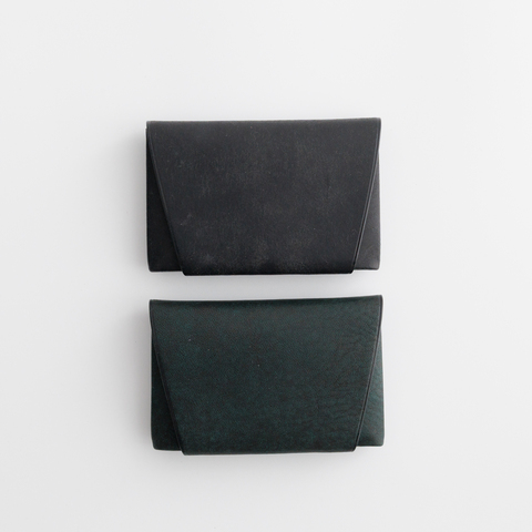 開閉には金具を使わず、フラップの先端を、名刺入れの断面に差し込む仕様。