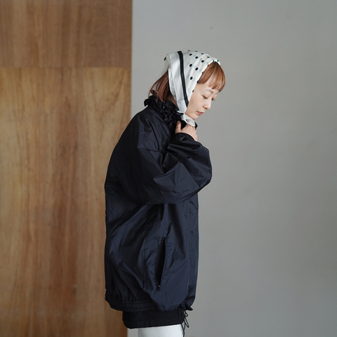 軽やかなナイロン素材を使用し、さらっと羽織れる軽量設計。身体のラインを拾いすぎない程よいゆとりがあり、インナーを選ばずレイヤードが楽しめます。