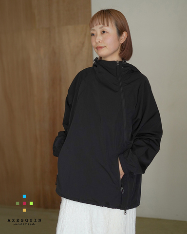 ななめに走るフロントファスナーデザインが特徴的なフードジャケットです。ファスナー上部にスナップボタンを配置しており、オープン時もきれいなシルエットで着用できます。