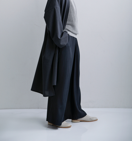 キュプラ特有のなめらかな肌触りと上品な光沢感に、ポリエステルの扱いやすさと程よいハリを兼ね備えています。軽やかで落ち感があり、ロングシーズン快適に着用いただけます。
