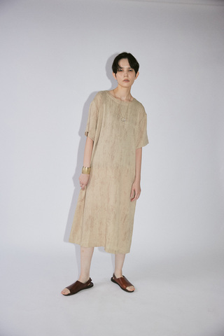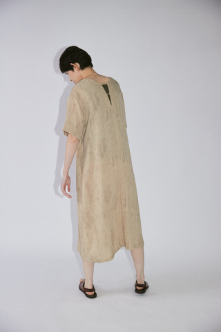 バックデザインが印象的なリラックスサイズのワンピース。リネン混ならではのさらりとした清涼感と、自然な凹凸のある風合いが、軽やかで涼しげな表情を作り出します。落ち感のある生地が体のラインを拾わず、ロング丈ながらも重く見えず、動くたびにふんわりと揺れる柔らかなドレープが魅力です。