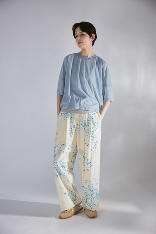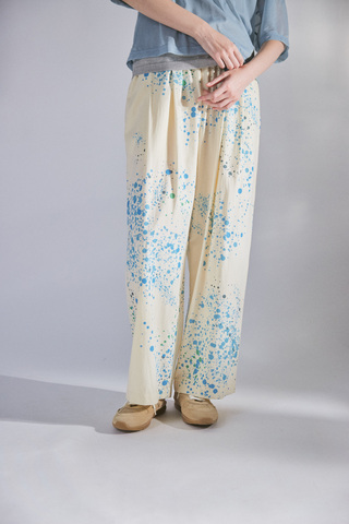 シーズンテーマ「WATER RIPPLES=水の波紋」をイメージして描かれたオリジナルプリントのイージーパンツ。軽やかで柔らかい生地感が足の動きに合わせて自然に揺れ、リラックスした穿き心地を実現します。