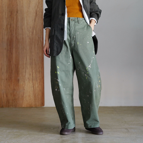 ミリタリーパンツとベイカーパンツをベースにした無骨さと、ペンキを飛ばして作った、軽やかなカラーとのバランスが絶妙。シンプルなトップスと合わせれば、こなれた大人カジュアルが完成します。