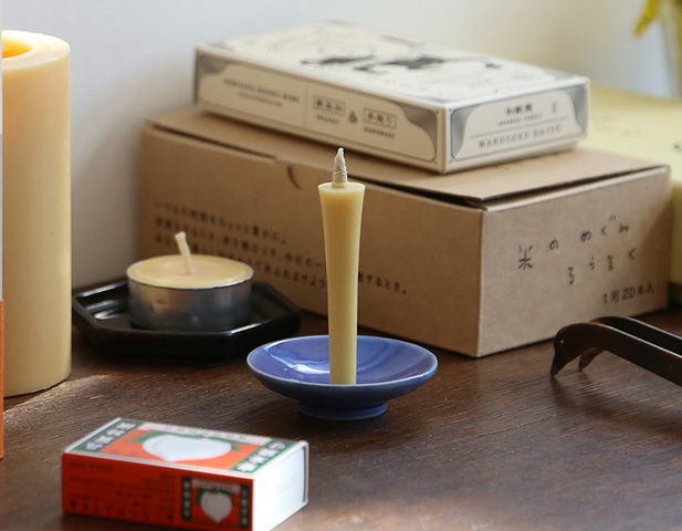石川県七尾市にある和ろうそくの老舗「高澤ろうそく」が作る、和ろうそく 米のめぐみ。材料は米油を作るときに出る米ぬか蝋から作られています。