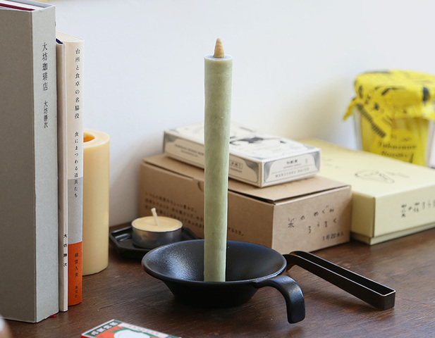 丸い器に持ち手が付いた燭台はとてもシンプル。鋳物の燭台は南部鉄でできており、安定感のあるずっしりとした重さ。大きなろうそくを立てても倒れる心配が無く、安心して灯すことができます。