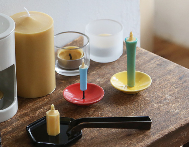 左側 豆ろうそくと緑、右側 2号ろうそくと紺青