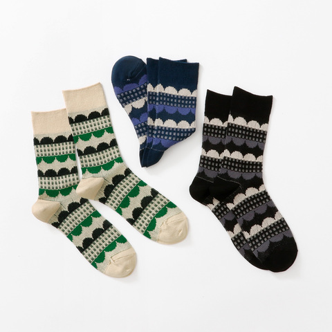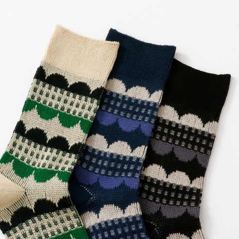 並んだ丸の幾何学柄とチェック柄を組み合わせた、ジャガード編みのソックス。