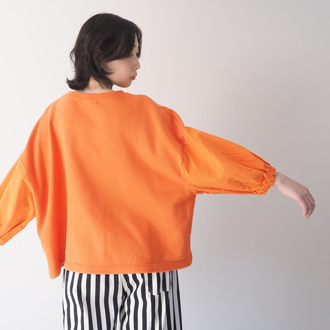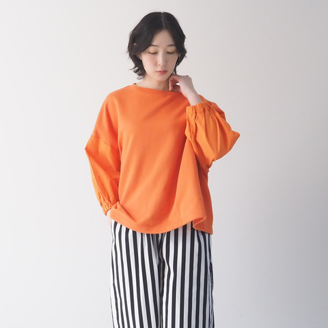 ふんわり袖で、さりげなく華やかな30/10セントラル裏毛×シーチングハンドワッシャー ワイドPOです。身頃は程よく厚みのある裏毛素材。袖は軽やかな布帛素材で切り替えられ、ほんのり立体感のあるボリュームスリーブに。