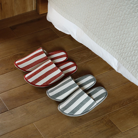 生成りのベースに太めのストライプが映え、軽やかさと存在感を併せ持っています。暮らしの風景に彩りを添えながらも自然と溶け込むようなスリッパです。