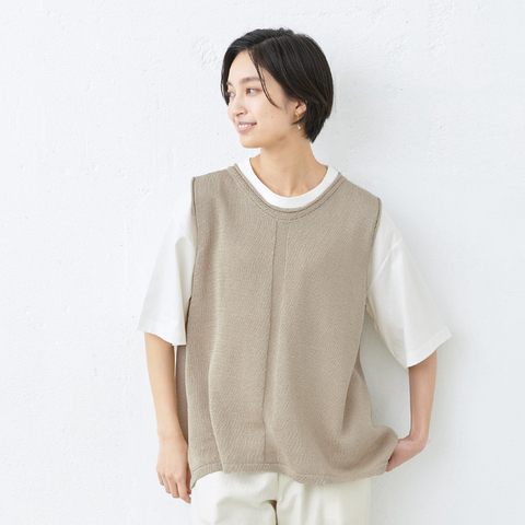 麻よりも麻らしいギマコットンだから、驚くほどさらりとした肌触り。風も通して涼しいニットです。編み出しの襟ぐりやセンターラインなどの細かなディテールもポイント。ゆったりとしたシルエットで、インナーによっていろいろな重ね着を愉しんでいただけるアイテムです。
