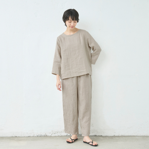 リネン100%の織物はよく見かけますが、糸切れしやすく編み立てるのが難しいリネンを、他の素材を交ぜる事なく、和歌山のメリヤス工場でゆっくりと丁寧に編み立ててつくりあげたカットソー素材(編み物)のプレミアムリネン®。リネンならではの、さらりとした風合いで、素肌に着ると非常に心地よい。また、吸放湿性に優れているので、汗をかいても爽やかさを持続。風通しもよく真夏でも蒸れにくく非常に涼しく着ていただけます。「着て」「洗濯」を繰り返す度に、風合いも柔らかく馴染んでいきます。そんなプレミアムリネン®を是非お試しください。