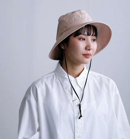 綿のやわらかさと麻の清涼感をあわせ持つ綿麻ウェザー生地を使用し、軽やかでありながら程よいハリ感のある仕上がり。高密度に織られたウェザー素材は、型崩れしにくく、美しいシルエットをキープ。かぶるだけでスタイリング全体が引き締まり、こなれた印象に整います。折りたたみが可能なので、バッグに収納しやすく、旅行やお出かけにも便利。日常使いからレジャーシーンまで幅広く活躍します。