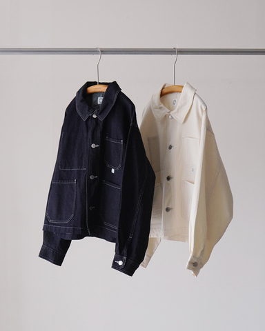こちらはショート丈のフレンチカバーオール。大きめの衿とドロップショルダーがつくる柔らかなラインが、きれいめカジュアルにもなじむ一着です。
