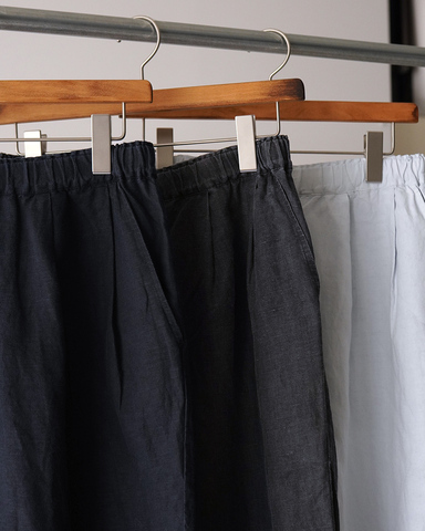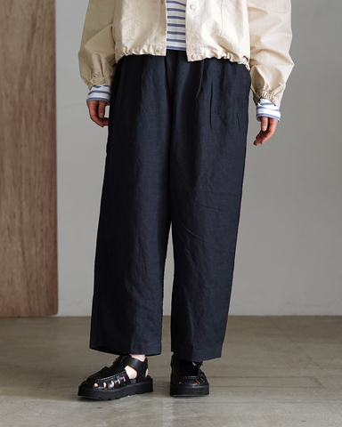 風をはらむような軽やかさと、穿くほどに深まる味わいが魅力のタックバギーパンツ。リネンコットンの交織生地にピグメント加工を施し、ほのかにかすれた表情がヴィンテージライクな雰囲気を演出します。