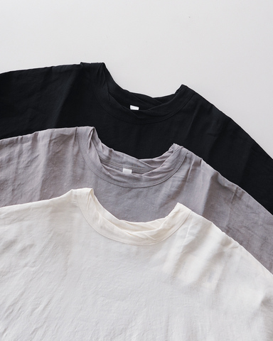 リネンレーヨンにストレッチ性を加えた生地で、ほどよい落ち感があり、さらっとした肌触りが特徴です。リネンの風合いで、ナチュラルに品よく着られます。