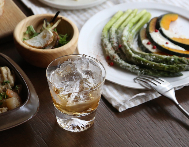 ひとつひとつが職人さんの手作り。透明感があってきれいな硝子。手にすれば、ずっしりとくる重み。ひと口のウイスキーが大切に思える、ロックグラスの役割にもしっかり貢献しています。