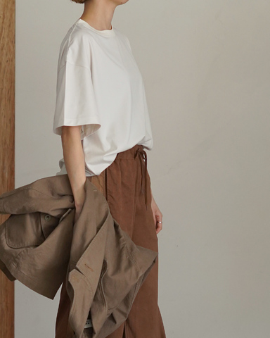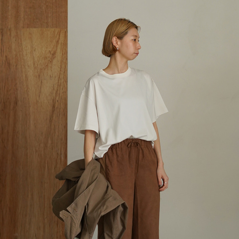 カジュアルなTシャツながら、ブラウスのような品の良さを兼ね備えているため、通勤やきれいめコーデにも活躍。マニッシュにも、ラフにも振れる、素材の良さと仕立ての美しさが際立つ一着です。