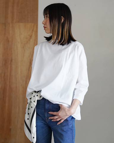 なめらかな光沢としっかりとした生地が魅力の七分袖ワイドTシャツです。上質なスーピマコットンポンチ素材を使用。程よい厚みと優れたストレッチ性で、リラックスして着られる心地よさです。
