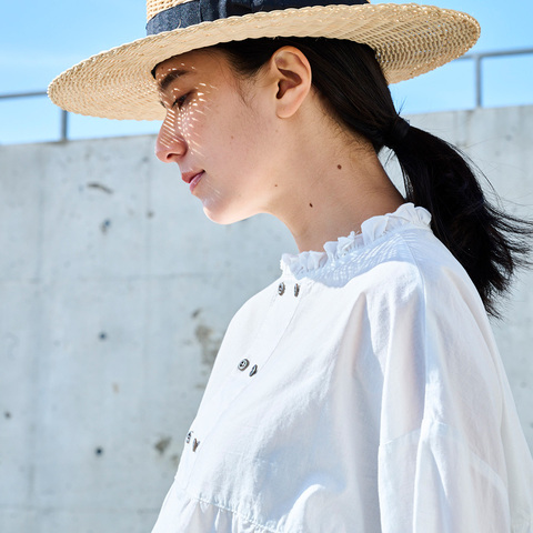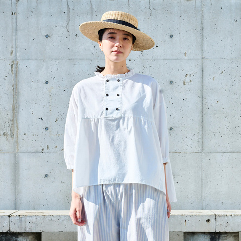 日差しをやさしく受け止める、軽やかな綿麻素材です。フリル襟とダブルボタンが、横顔にさりげないニュアンスを添えます。