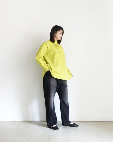 バンドカラーのすっきりとした首元に、ほどよくハリのある生地感が魅力です。