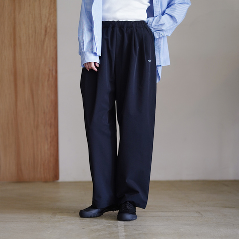 ゆとりのあるサイズ感とウエストゴム仕様で、締め付け感を抑えた快適な穿き心地に仕上げました。ウエストには紐を備え、着用感の調整が可能です。ストレッチ性のあるダブルクロス生地を採用。
