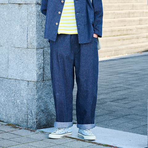 ブーレットノイル特有の凹凸感とネップが、ざっくりとしたナチュラルなルックスを引き立たせている、コットンシルクブーレットノイルデニム ノッポパンツです。腰まわりはゆったり、裾に向かって自然に落ちるフォルムで“太いのに重たく見えない”絶妙なバランスです。
