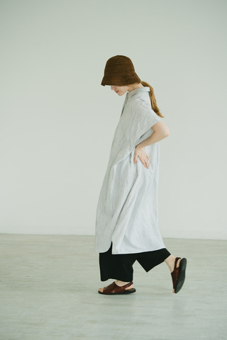ゆったりとしたシルエットでリラックス感がありながら、縦のラインを感じるデザインですっきりと見えるのも魅力。両脇にはポケットを備え、日常使いしやすい実用性も兼ね備えています。