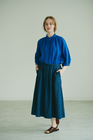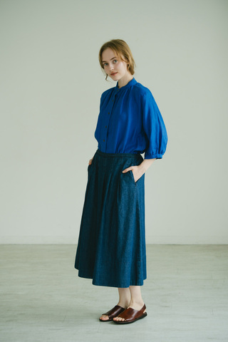 リネンをブレンドした軽やかなオリジナルデニムを使用した、表情豊かなタックスカート。ほどよい厚みとナチュラルな風合いが心地よく、デニムでありながらもどこかやわらかく、上品な印象を与えてくれます。
