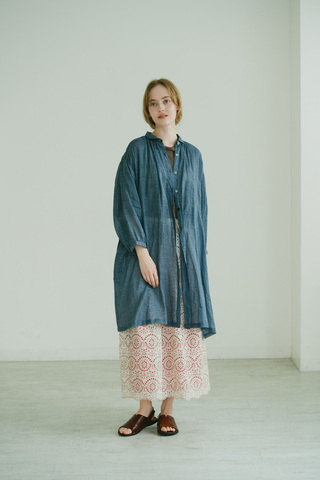 身体を包み込むようなゆとりのあるフォルムで、リラックスした着心地ながらも、衿元のシャープさが全体をすっきりと見せてくれるバランスに。ワンピースとしてはもちろん、前開き仕様を活かして軽い羽織としても活躍します。