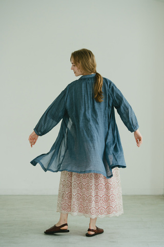 小さめでシャープな衿と、たっぷりと寄せたギャザーが印象的な人気デザイン。暑い季節にも心地よく過ごせるよう、軽やかさと風通しの良さにこだわって仕立てられた一着です。