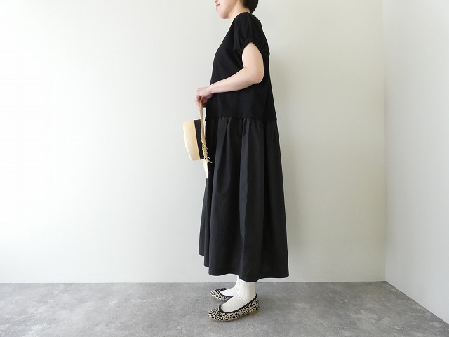 上身頃はなめらかなコットン天竺、スカート部分はほどよいハリのある生地で切り替えられ、