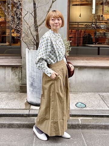 カーキのスカートが程よく引き締め、
