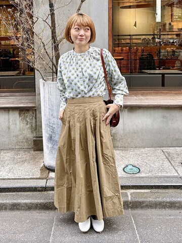 カーキのタックギャザーマキシスカートを合わせた、