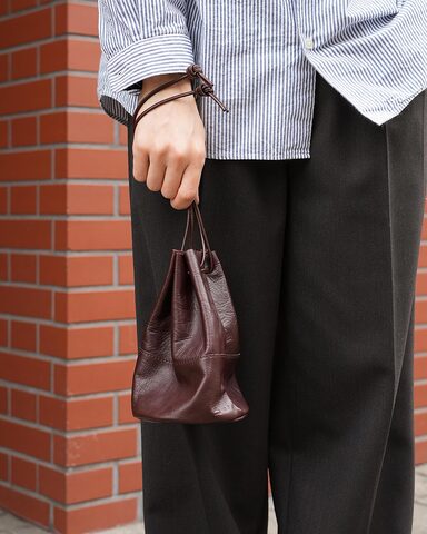 コロンとしたフォルムが特徴的な馬革の巾着ポーチです。