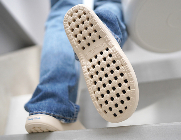 雨や水がたまりにくい水はけを促す加工で、サラッと快適。水に強いEVA樹脂素材なので、水がかかっても乾きやすく、使用後はサッと洗い流せるので、いつでも清潔に保てます。