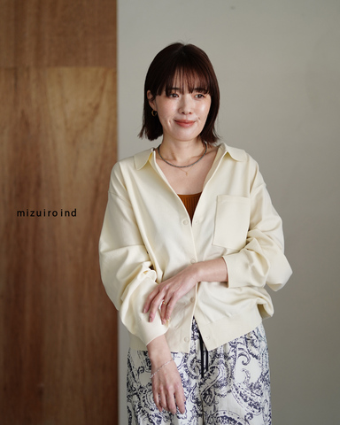 弾力のあるジャージー素材が生み出す柔らかなドレープが、大人の落ち着きを引き立てます。カーディガンでありながら衿付きのデザインが、ジャケットライクな表情も。