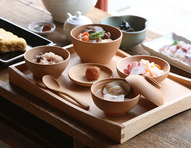 お食い初めセットはピッコロボウルのSとL、ディッシュのSとL、蓋付き碗、スプーン、トレーの7点セットになっており、ビーチ(ブナ)材で作られています。一つ一つ丁寧に轆轤(ろくろ)で削り出された器は、手にしっくりとくる滑らかな使い心地。全てウレタン仕上げされており、取り扱いやすいのもうれしい限り。