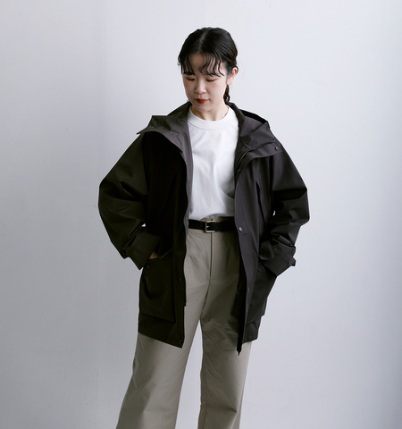 中に薄手のセーターを着用し、着丈は膝上約19cmの辺りで袖丈は指の第2関節が隠れる長さでした。サイズ感は全体的に大きめで厚手のトップスを合わせても窮屈感は感じられなさそうです。生地はしっかりしており、フードも深く被れるので雨風を凌げそうです。