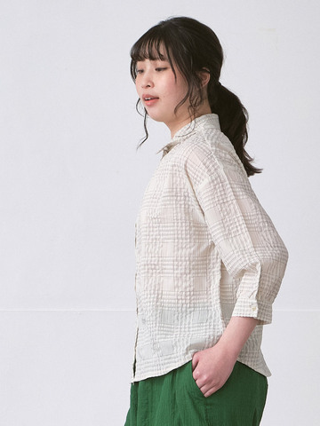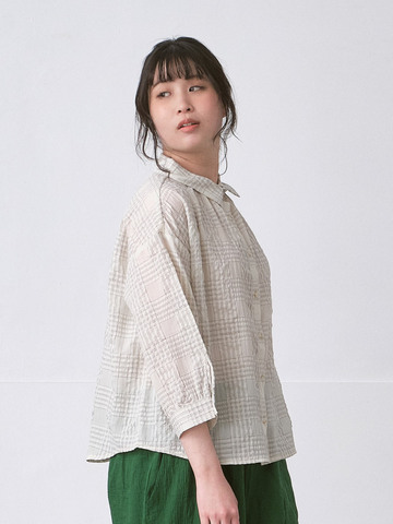 さらりと軽い綿混生地で仕立てたコンパクトな丈感のちび襟ブラウス