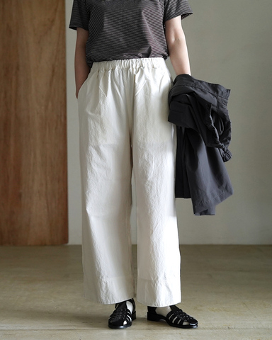 ウエストは総ゴム仕様で、気負わず穿けてノンストレス。ヒップのポケットが後ろ姿にアクセントを加え、シンプルながらも表情のある一本に仕上げています。