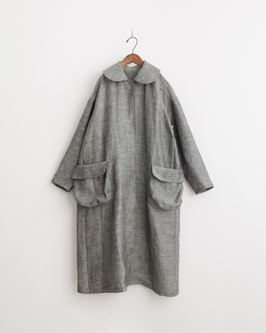 クルーネックコートをベースに大きな丸衿と、フラップポケットがついたデザイン。