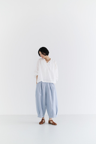 裾にタックを施しカフスをつけることで、足まわりはふんわりとしながら、裾はすっと収まるメリハリのあるかたちに。足首が少し見えるほどの着丈で、全体のバランスをすっきりと整えています。