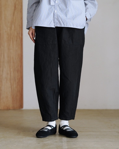 ほどよいハリと軽やかさをあわせ持つ高密度ウェザー生地で仕立てた、裾ダーツパンツ。ゆとりのある腰まわりから裾にかけて緩やかにテーパードするシルエットが、リラックス感と上品さを両立します。