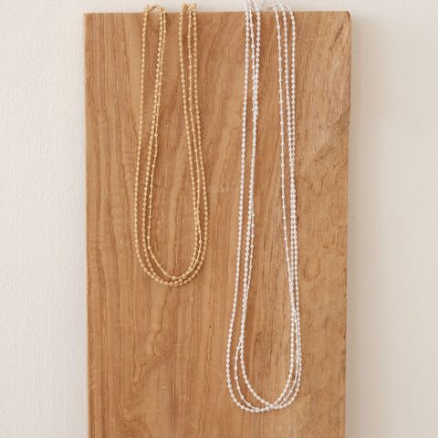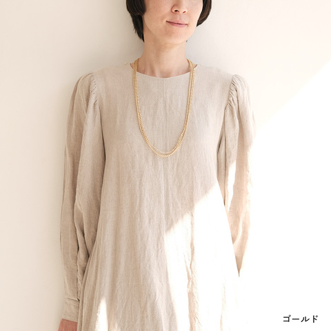 1本のロングネックレスを重ねづけするのではなく、もともと3連としてデザインされているため、バランスよく整った印象に。